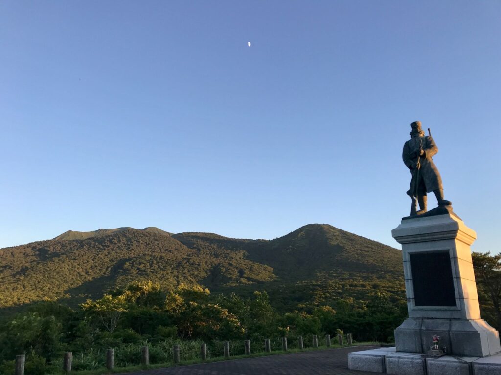 後藤伍長の銅像の向こうには八甲田山と突き抜ける青空に半月。本当にここで遭難事故が起きたのだろうかと、信じられなくなる。