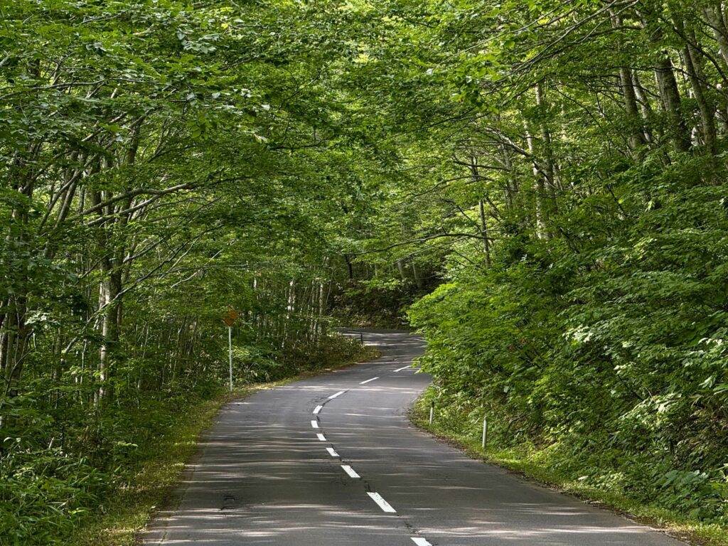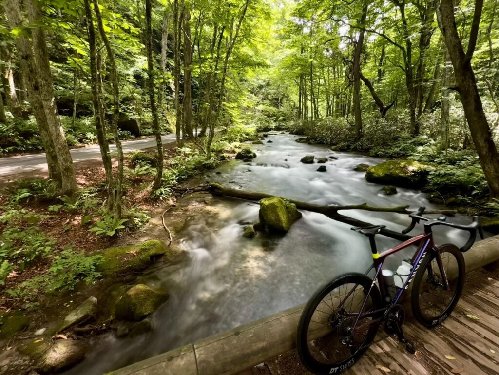 二度目は2025年8月。ブナ林のフィルターを通過した強い日差しが、路面に斑模様を描く。緩斜面のハイスピードクライミングで、それが瞬く間に流れていく。酷暑の夏でありながら、緑と清流のおかげか涼しさすら感じる、心地の良いクライミングとなった。