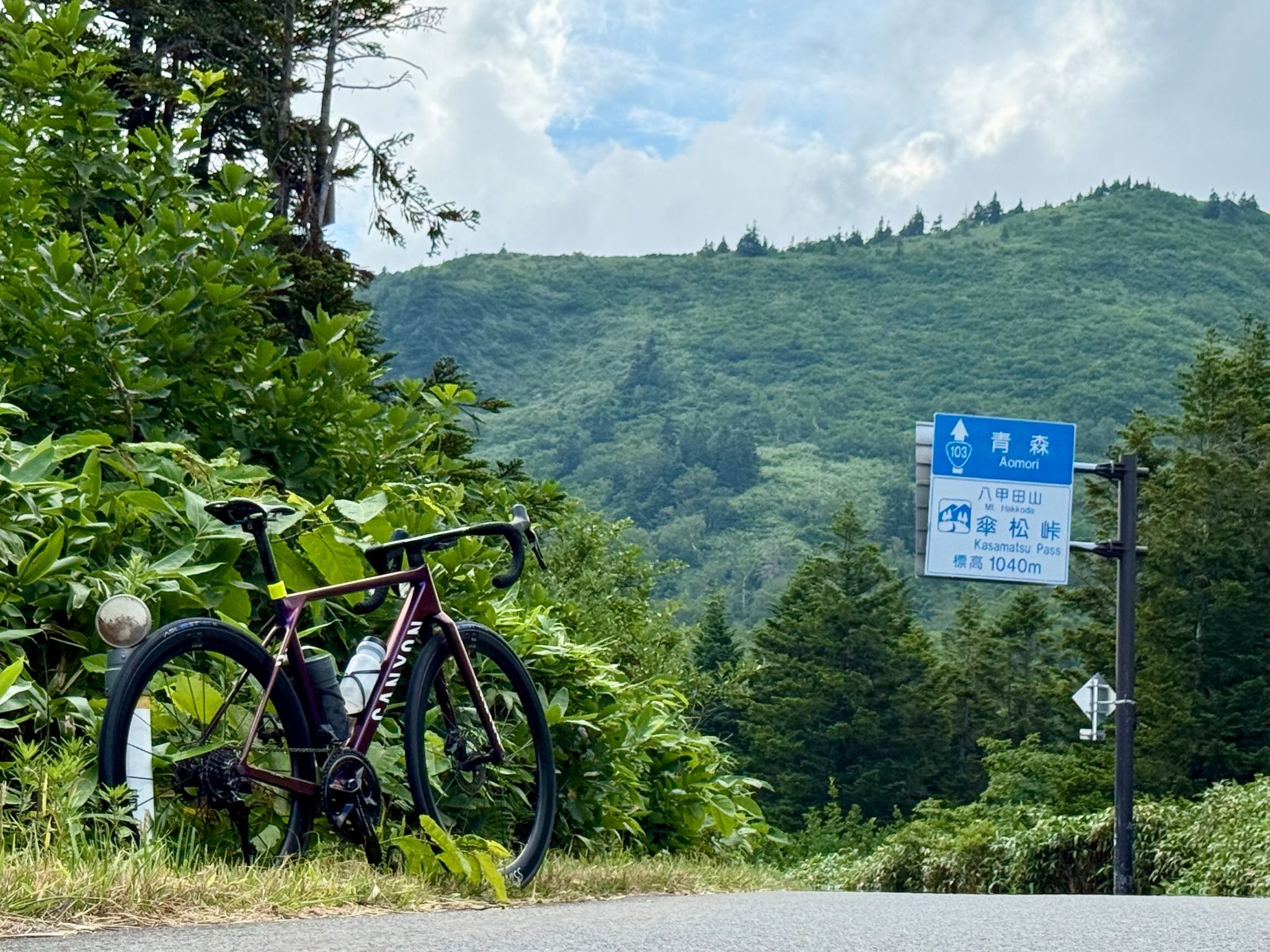 低木と笹原に囲まれた開放感ある峠の一帯。右手には八甲田の山並み。そして「傘松峠」の看板が大きな存在感を放つ。ヒルクライムを終えた満足感が一層大きくなる。