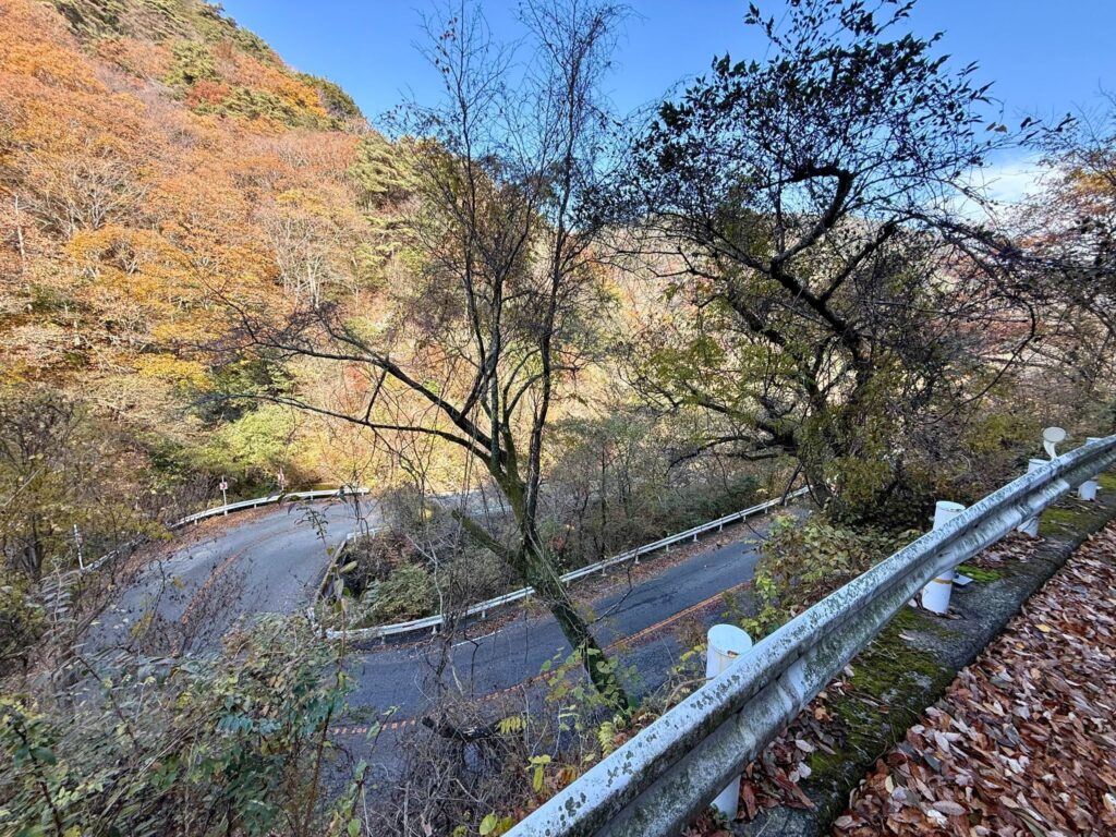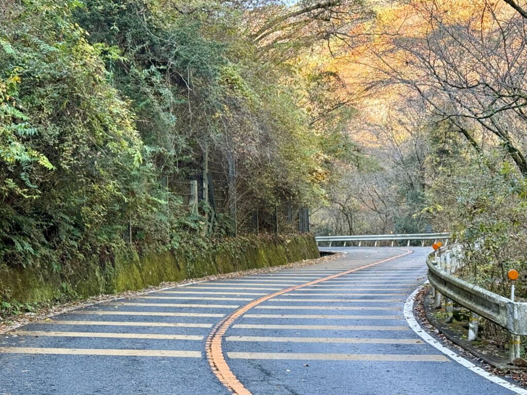 九十九折といっても大きく曲がらず、直線的に伸びる急坂が多い。路面には滑り止めの横縞ペイントが続き、それが傾斜の厳しさを視覚的にも突きつける。ハイスピードで信号のある前半があってこそ、何にも邪魔されることなく、激坂と、そして自分と向き合う後半の素晴らしさが、よりはっきりと際立つ。