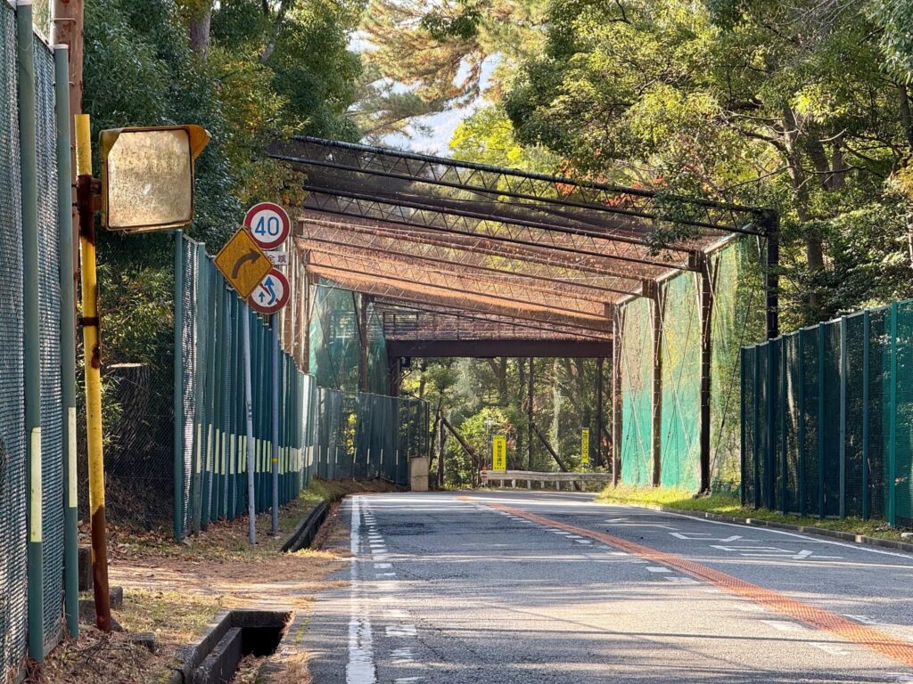 逆瀬川を離れると、道の両側にゴルフ場が広がる区間に入る。緩い下りを挟み、フェンスに覆われたトンネル状の道を走るため、実際の速度以上のスピードを感じる。後半の急勾配区間に向けて、六甲山の懐深くに、吸い込まれていくような感覚を覚える。