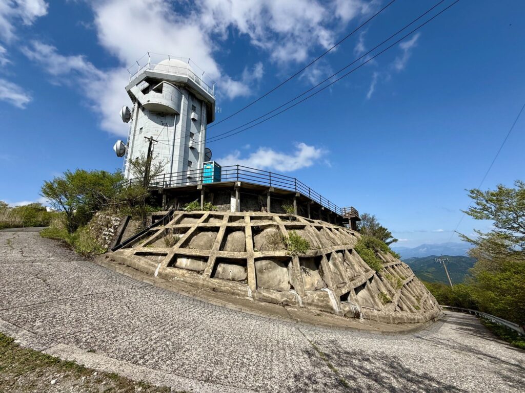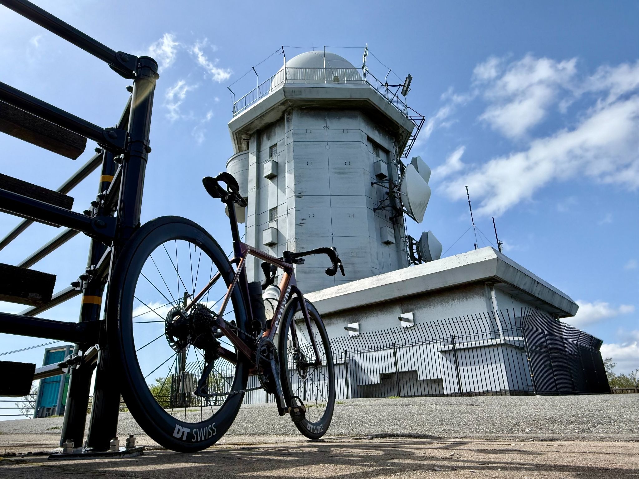 最後に再び牙をむく超急勾配。20%に迫るような激坂をクリアすると、やっと山頂に辿り着くわけである。そこには、今まで登ってきた激しいヒルクライムの興奮とは対照的に、無機質の人工物、雨量観測レーダーがポツンと建っている。