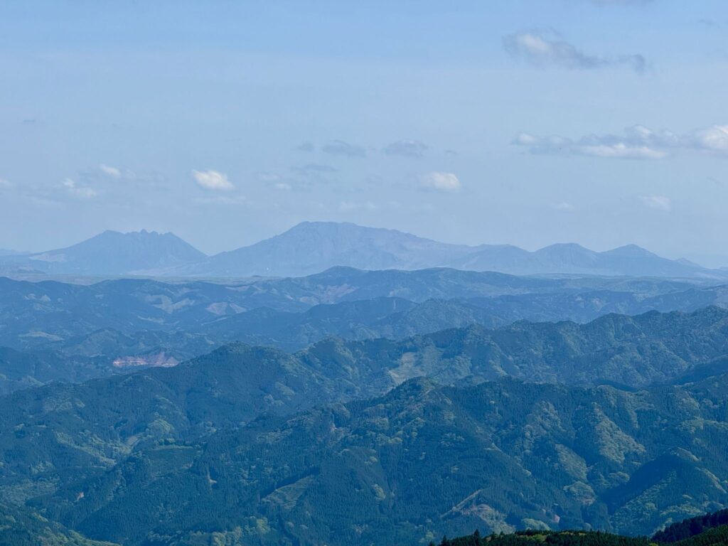 山頂は360度の大パノラマ。登ってきた悪路のことなどすぐに忘れて、景色に見入ってしまう。脊振山や三郡山といった福岡の高峰はもちろん、阿蘇、九重、祖母・傾といった九州を代表する名峰の数々を一望できる。