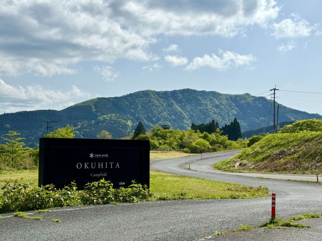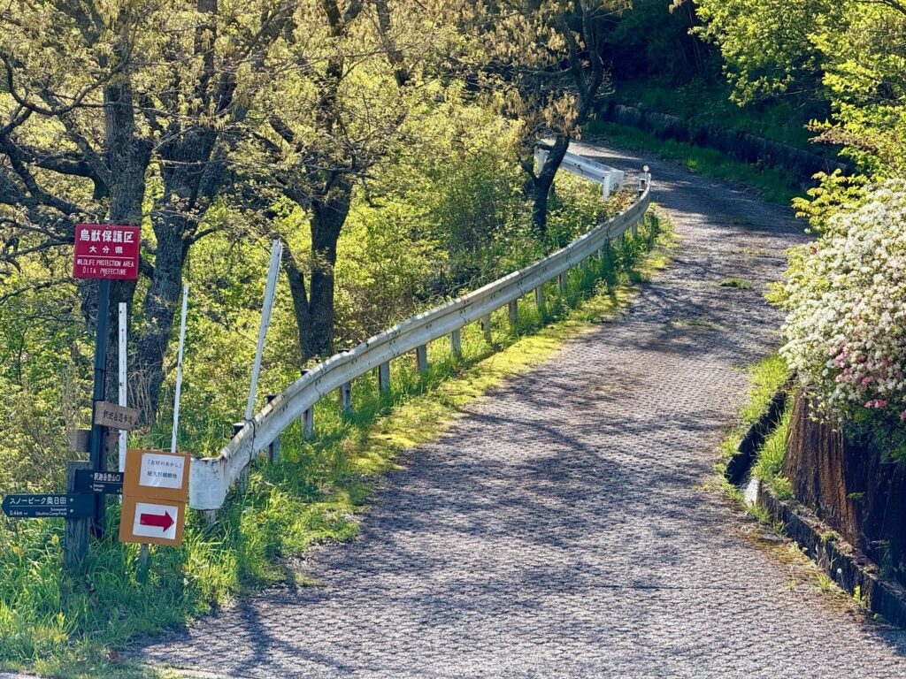 途中には分岐がいくつかあるが、道に迷う心配はない。ヒルクライムレースのフィニッシュ地点近くにある。スノーピークの「奥日田キャンプフィールド」へ導く黒地の案内板が、まるで誘導灯のように進む方向を示してくれる。