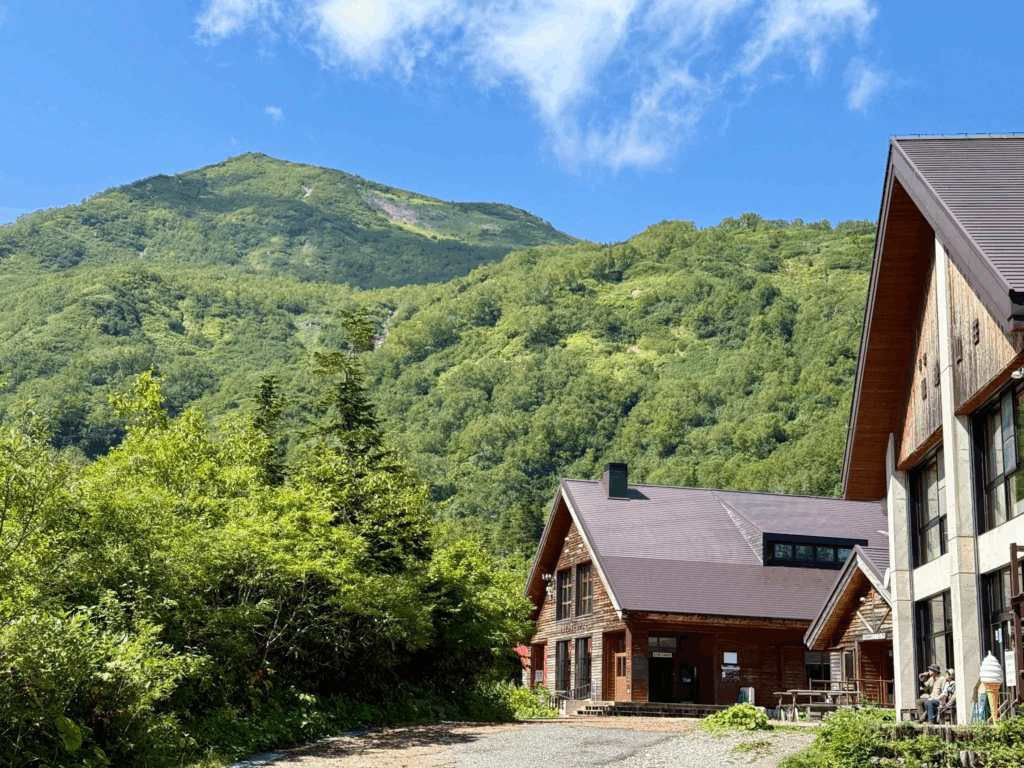 フィニッシュ地点から少し奥に進むと、観光拠点となるビジターセンターがある。北アルプスを間の前に食事をすることもできる。