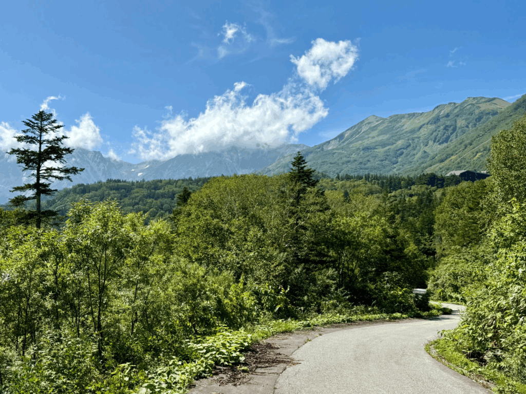 勾配は容赦なく、緩む区間はほとんどない。樹林帯に入れば静寂の中で息遣いが響き、スキー場のゲレンデに飛び出せば、雄大な北アルプスが顔を覗かせる。繰り返し頭上を横切るゴンドラとともに、ペダルを踏み続ける。
