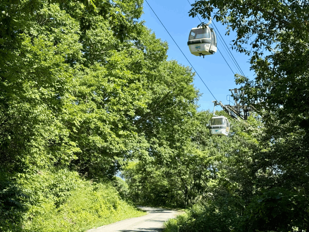 樹林帯の中、黙々とペダルを踏む。木々の切れ間に、ゴンドラが現れては消える。